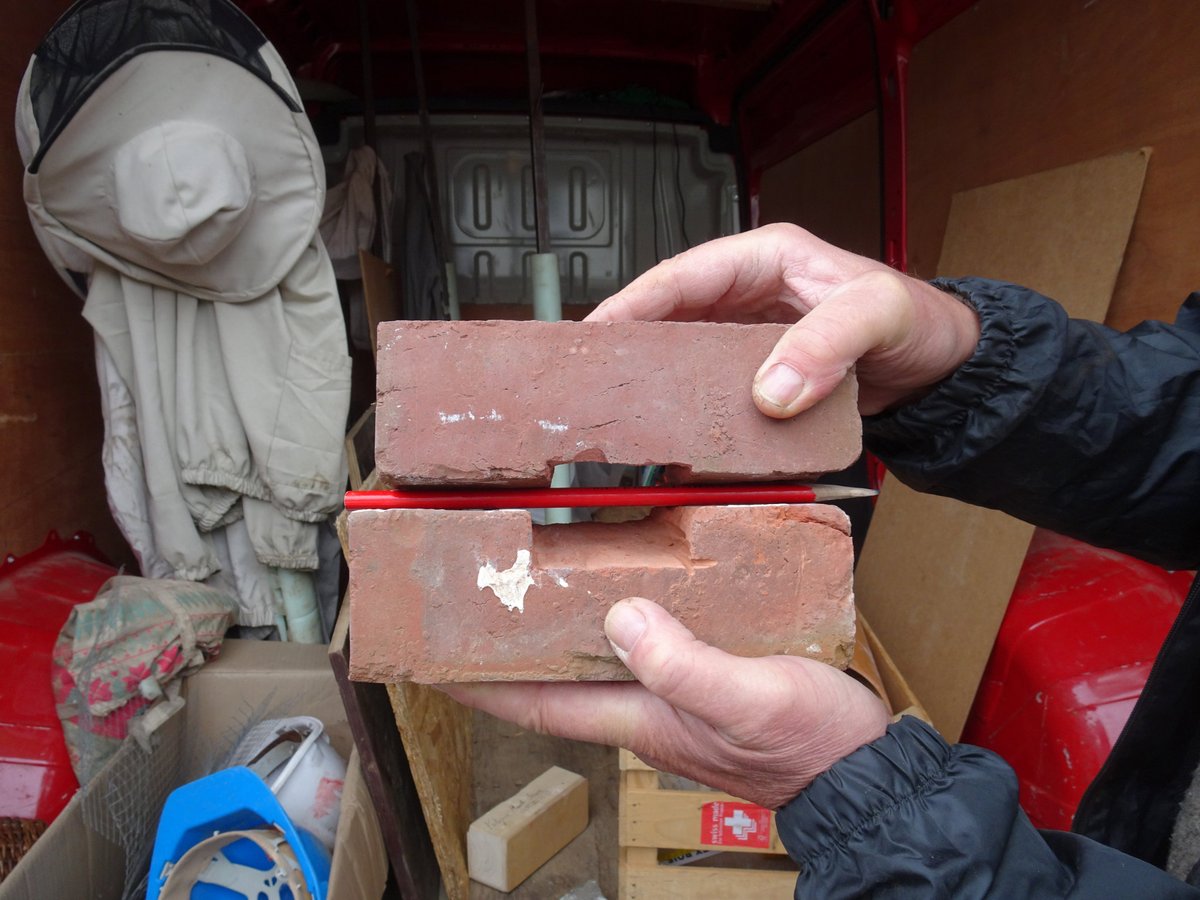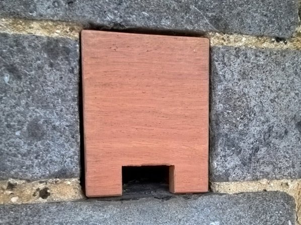 - Maçonner une brique chanfreinée ou biseautée (selon la méthode mise au point en Italie par Mauro Ferri), permettant d’obstruer partiellement le trou tout en laissant les petits oiseaux (dont les Martinets) s’y abriter. Les triangles auront une épaisseur permettant de laisser un passage libre compris entre 3,7 et 5 cm. En tout état de cause, en cas de trous proches de la forme carrée, évitez à tout prix qu’une des dimensions excède 5 cm si vous voulez empêcher la nidification des pigeons, souvent perçus comme indésirables.