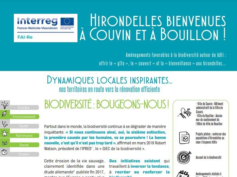 Pour plus d'informations, accéder à l'article d'Espace Environnement asbl. : Hirondelles bienvenues à Couvin et à Bouillon.