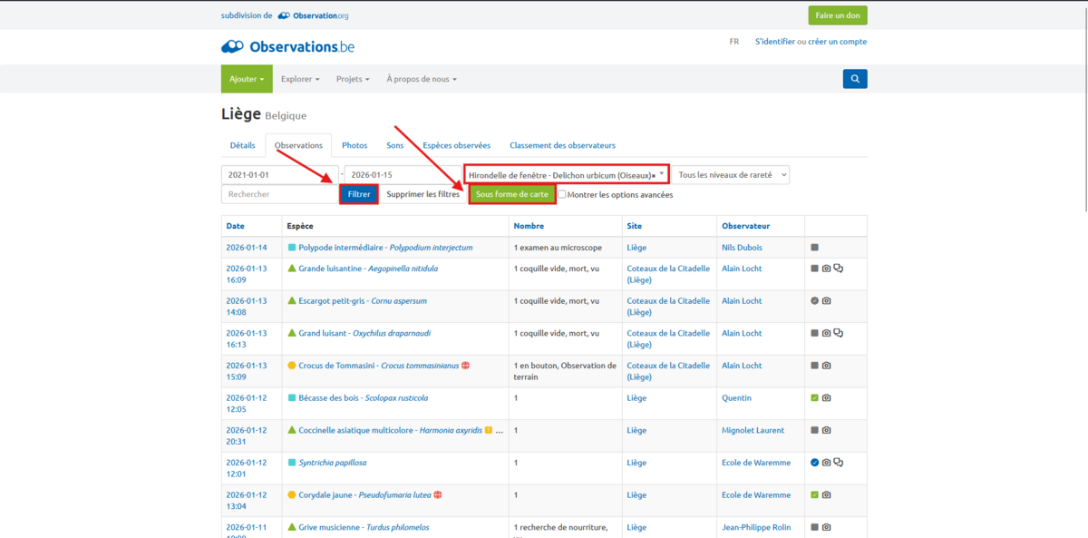 Avec la liste préalablement faite des espèces susceptibles d’être présentes, sélectionnez une espèce voulue, cliquez sur « filtrer » suivi de « sous forme de carte ».