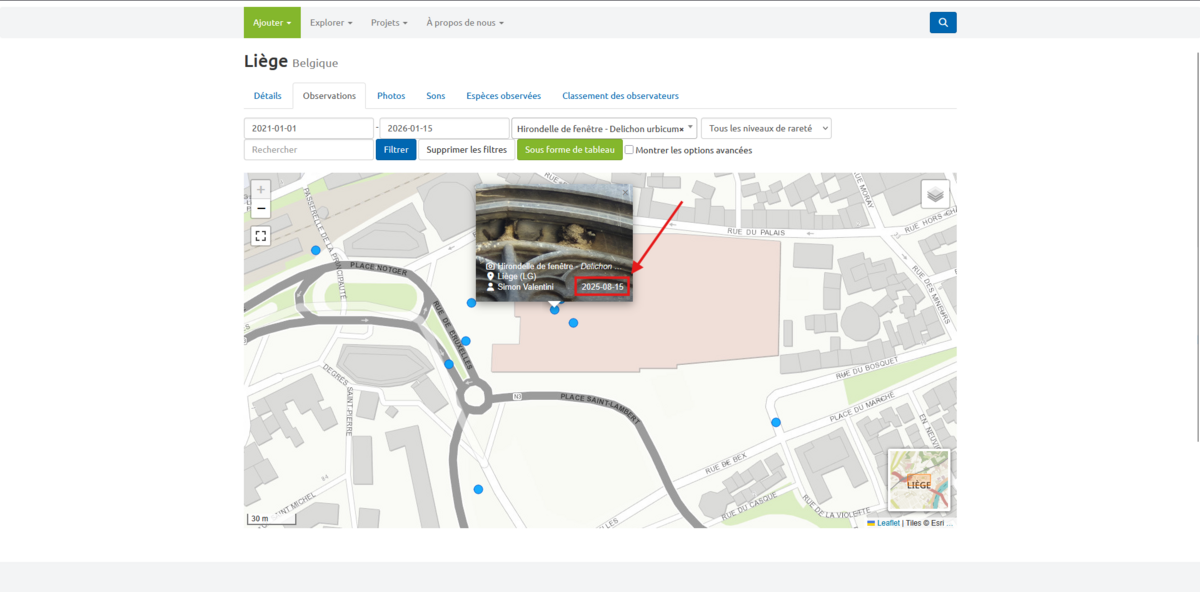 Vous pouvez maintenant naviguer sur la carte vers votre lieu de travail et regarder si une observation a été faite.