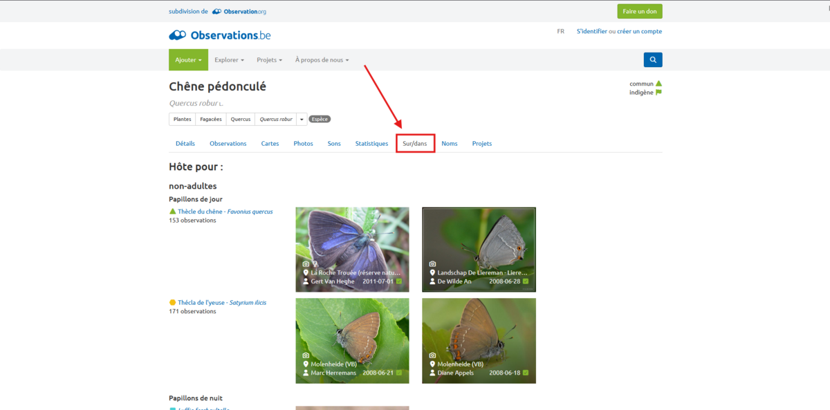 Une autre utilisation de l’outil observations.be, pour les architectes, est de voir quelles espèces peuvent se développer autour d’une autre. Cela peut se voir dans l’onglet « Sur/dans » sur la page d’une espèce en particulier. Cela permet de savoir, par exemple, quelles espèces peuvent se trouver sur un chêne pédonculé. C’est surtout pour prendre conscience qu’une espèce en amène d’autres.